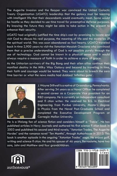 The Augerite invasion and the Reaper war convinced the United Galactic Treaty Organization (UGATO) leadership that the galaxy must be teeming with intelligent life that their descendants would eventually meet. Some would be hostile so they decided to use time travel for preemptive defense purposes. By knowing the future they might be able to take action in the present to enhance their security. UGATO had originally justified the time ship's cost by promising to locate and visit God to discuss his real purpose, the meaning of life and the mysteries of the spiritual world. This was soon abandoned as fool hearty. UGATO traveled back in time 2,900 years to visit the Xetonian Messiah Graciana who convinced them that a precise understanding of God is not possible purely through the use of technology. God cannot be known in a physical sense and it would always require a measure of faith in order to achieve a state of grace. As the Unitarian survivors of the Big Bang and their alien allies continue their manifest destiny in the Milky Way Galaxy and beyond by traveling in time, their faith and courage would be tested. They were about to breech the zero time barrier or what the news media had dubbed 'Infinities gate'.