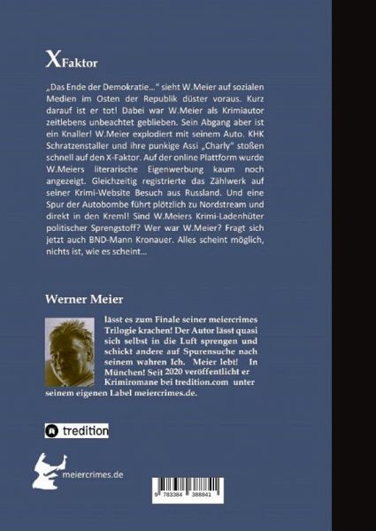 Krimischreiber W.Meier warnt auf der social media Plattform X hartnäckig vor dem Orangenmann und sieht mit ihm das Ende der Demokratie in den USA kommen. Und vorher schon mit Landtagswahlen den Osten der Bundesrepublik in die Hände des Russen fallen. Dabei bleibt er als Autor zeitlebens unbeachtet. Bei seinem Abgang aber macht W.Meier mit einem Knaller auf sich aufmerksam! Er explodiert mit seinem Auto. Kurz darauf wird seine Kundenberaterin bei der Sparkasse ermordet. Sie hatte dem Erfolglosen einen Dispo abgelehnt. KHK Schratzenstaller und ihre punkige Assi Charly stoßen schnell auf den XFaktor: Auf der online-Plattform wurde W.Meiers Krimi-Eigenwerbung zusätzlich zum kollektiven Desinteresse auch vom Algorithmus stark eingebremst. X-Besitzer: der reichste Mann der Welt und russische Oligarchen. Zuletzt registrierte das Zählwerk auf W.Meiers Website neugierigen Besuch aus Russland. Und eine Spur der Autobombe führt plötzlich zu Nordstream! Sind W.Meiers Krimi-Ladenhüter politischer Sprengstoff? Wer war W.Meier? Fragt sich jetzt auch BND-Mann Kronauer. Alles scheint möglich, nichts ist, wie es scheint...