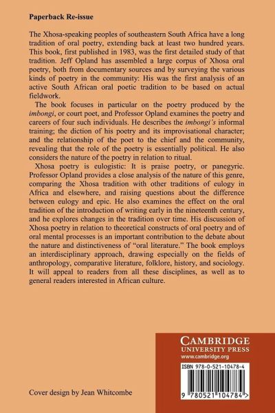 The Xhosa-speaking peoples of south-eastern South Africa have a long tradition of oral poetry, extending back at least two hundred years. This book, first published in 1983, was the first detailed study of that tradition. Jeff Opland has assembled a large corpus of Xhosa oral poetry making his the first analysis of an active South African oral poetic tradition to be based on actual fieldwork. The book focuses in particular on the poetry produced by the imbongi, or court poet, and Professor Opland examines the poetry and careers of four such individuals. He describes the imbongi's informal training, the diction of his poetry and its improvisational character and the relationship of the poet to the chief and the community, revealing that the role of the poetry is essentially political. He also considers the nature of the poetry in relation to ritual. His discussion of Xhosa poetry in relation to theoretical constructs of oral poetry and of oral mental processes is an important contribution to the debate about the nature and distinctiveness of 'oral literature'. With its interdisciplinary approach, it will appeal to readers from many disciplines as well as to general readers interested in African culture.