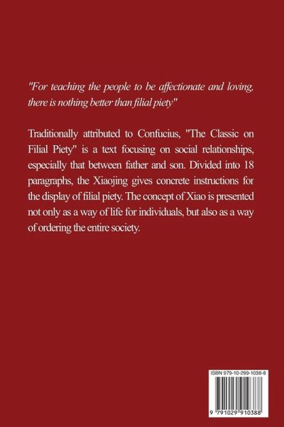 "For teaching the people to be affectionate and loving, there is nothing better than filial piety" Traditionally attributed to Confucius, "The Classic on Filial Piety" is a text focusing on social relationships, especially that between father and son. Divided into 18 paragraphs, the Xiaojing gives concrete instructions for the display of filial piety. The concept of Xiao is presented not only as a way of life for individuals, but also as a way of ordering the entire society.