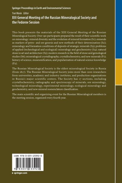 This book presents the materials of the XIII General Meeting of the Russian Mineralogical Society. Over 190 participants prepared the result of their scientific work on mineralogy: mineral diversity and the evolution of mineral formation (S1); minerals as markers of petro- and ore genesis and new methods of their determination (S2); mineralogy and formation conditions of deposits of strategic minerals (S3); problems of applied (technological and ecological) mineralogy and geochemistry (S4); natural stone in art and architecture (S5); modern research in the field of stone and gemological studies (S6); mineralogical crystallography, crystallochemistry, and new minerals (F1); history of science, museumification, and popularization of natural science knowledge (F2).