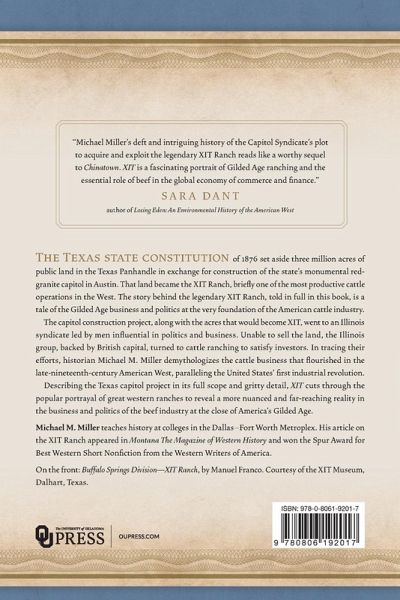 The Texas state constitution of 1876 set aside three million acres of public land in the Texas Panhandle in exchange for construction of the state's monumental red-granite capitol in Austin. That land became the XIT Ranch, briefly one of the most productive cattle operations in the West. The story behind the legendary XIT Ranch, told in full in this book, is a tale of Gilded Age business and politics at the very foundation of the American cattle industry. The capitol construction project, along with the acres that would become XIT, went to an Illinois syndicate led by men influential in politics and business. Unable to sell the land, the Illinois group, backed by British capital, turned to cattle ranching to satisfy investors. In tracing their efforts, which expanded to include a satellite ranch in Montana, historian Michael M. Miller demythologizes the cattle business that flourished in the late-nineteenth-century American West, paralleling the United States' first industrial revolution. The XIT Ranch came into being and succeeded, Miller shows, only because of the work of accountants, lawyers, and managers, overseen by officers and a board of seasoned international capitalists. In turn, the ranch created wealth for some and promoted the expansion of railroads, new towns, farms, and jobs. Though it existed only from 1885 to 1912, from Texas to Montana the operation left a deep imprint on community culture and historical memory. Describing the Texas capitol project in its full scope and gritty detail, XIT cuts through the popular portrayal of great western ranches to reveal a more nuanced and far-reaching reality in the business and politics of the beef industry at the close of America's Gilded Age.