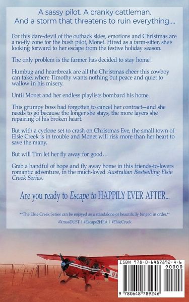 A sassy pilot. A cranky cattleman. And a storm that threatens to ruin everything... For this dare-devil of the outback skies, emotions and Christmas are a no-fly zone for the bush pilot, Monet. Hired as a farm-sitter, she's looking forward to her escape from the festive holiday season. The only problem is the farmer has decided to stay home! Humbug and heartbreak are all the Christmas cheer this cowboy can take, where Timothy wants nothing but peace and quiet to wallow in his misery. Until Monet and her endless playlists bombard his home. This grumpy boss had forgotten to cancel her contract-and she needs to go because the longer she stays, the more layers she repairing of his broken heart. But with a cyclone set to crash on Christmas Eve, the small town of Elsie Creek is in trouble and Monet will risk more than her heart to save the many. But will Tim let her fly away for good... Grab a handful of hope and fly away home in this friends-to-lovers romantic adventure, in the much-loved Australian Bestselling Elsie Creek Series. Are you ready to Escape to a HAPPILY EVER AFTER? **The Elsie Creek Series can be enjoyed as a standalone or beautifully binged in order** #XmasDUST #Escape2HEA #ElsieCreek