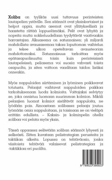 Xoliba on tyylikäs uusi tuttavuus perinteisten lautapelien ystäville. Sen säännöt ovat yksinkertaiset ja helpot oppia, mutta asemat ovat yllätyksellisiä ja haastetta riittää loppuelämäksi. Pelit ovat lyhyitä ja nopeita mutta nokkeluudellaan tyydyttävät vaativaakin harrastajaa. Alkuasema on satunnainen: yli miljardi mahdollista avausasemaa takaa loputtoman vaihtelun ja tekee ulkoa opeteltavan avausteorian mahdottomaksi. Satunnaisuus tarkoittaa myös epätasapuolisuutta: toisin kuin perinteisissä lautapeleissä, peliasema voi suosia vahvasti toista osapuolta, ja siten voittoon vaaditaan taidon lisäksi onneakin. Myös nappuloiden siirtäminen ja lyöminen poikkeavat totutusta. Pelaajat vaihtavat nappuloiden paikkaa tarkoituksenaan luoda kolmioita. Voittajaksi selviytyy se, joka onnistuu luomaan suurimman kolmion. Mikäli pelaajien luomat kolmiot sisältävät nappuloita, ne lyödään pois. Ainoastaan xolibassa pelaaja joutuu lyömään omia nappuloitaan, ja toisinaan se on vieläpä erittäin edullista. Kaksin- ja kolminpelin ohella xolibaa voi pelata myös yksin. Tässä oppaassa selitetään xoliban säännöt lyhyesti ja selkeästi. Sitten kuvataan pelistrategian perusteita ja taktiikan alkeita. Lopussa on tehtäväosio, jonka viisitoista tehtävää valaisevat pelistrategiaa ja -taktiikkaa eri puolilta.