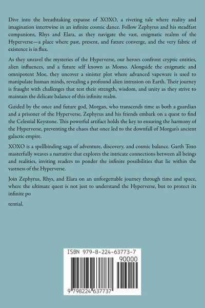 Dive into the breathtaking expanse of XOXO, a riveting tale where reality and imagination intertwine in an infinite cosmic dance. Follow Zephyrus and his steadfast companions, Rhys and Elara, as they navigate the vast, enigmatic realms of the Hyperverse-a place where past, present, and future converge, and the very fabric of existence is in flux. As they unravel the mysteries of the Hyperverse, our heroes confront cryptic entities, alien influences, and a future self known as Momo. Alongside the enigmatic and omnipotent Moe, they uncover a sinister plot where advanced vapeware is used to manipulate human minds, revealing a profound alien intrusion on Earth. Their journey is fraught with challenges that test their strength, wisdom, and unity as they strive to maintain the delicate balance of this infinite realm. Guided by the once and future god, Morgan, who transcends time as both a guardian and a prisoner of the Hyperverse, Zephyrus and his friends embark on a quest to find the Celestial Keystone. This powerful artifact holds the key to ensuring the harmony of the Hyperverse, preventing the chaos that once led to the downfall of Morgan's ancient galactic empire. XOXO is a spellbinding saga of adventure, discovery, and cosmic balance. Garth Toxo masterfully weaves a narrative that explores the intricate connections between all beings and realities, inviting readers to ponder the infinite possibilities that lie within the vastness of the Hyperverse. Join Zephyrus, Rhys, and Elara on an unforgettable journey through time and space, where the ultimate quest is not just to understand the Hyperverse, but to protect its infinite po tential.