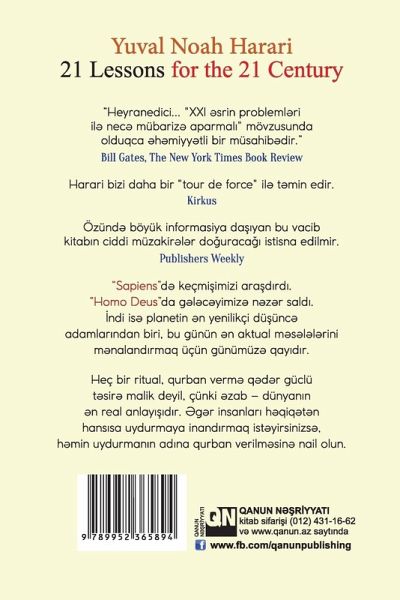 Yuval Harari anlä¿lmas¿ günd¿n-gün¿ ç¿tinl¿¿¿n yäad¿¿¿m¿z bu dünyadan yaz¿r. ¿nsanl¿q özünü nüv¿ müharib¿si, ekoloji f¿lak¿t v¿ texnoloji q¿zalar t¿hlük¿sind¿n nec¿ xilas ed¿ bil¿r? Yalan x¿b¿rl¿r epidemiyas¿ il¿ mübariz¿ aparmaq iqtidar¿nday¿qm¿? Dünyada hans¿ sivilizasiyalar dominantl¿q edir ¿ ¿¿rq, Q¿rb? Terrorizm¿ qar¿¿ hans¿ t¿dbirl¿ri görm¿liyik? Mü¿llif özün¿m¿xsus ayd¿n fikirl¿rl¿ diqq¿timizi bugünkü dünyam¿z¿n heyr¿tamiz probleml¿rin¿ c¿lb edir. Kitab¿n ¿sas h¿d¿fi oxucunun fikrini dünyadak¿ daimi v¿ t¿hlük¿li d¿yi¿iklikl¿r¿ yön¿ltm¿k, h¿m d¿ onda h¿yat qabiliyy¿tini gücl¿ndirm¿k, r¿hmdillik hissini v¿ kritik dü¿ünm¿ v¿rdi¿l¿rini inki¿af etdirm¿kdir.