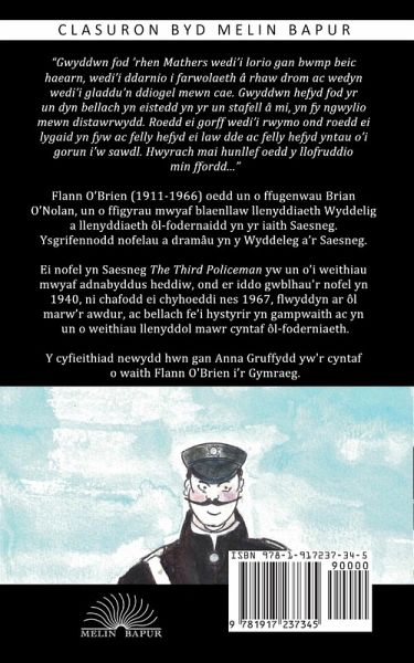 (Welsh translation of Flann O'Brien's post-modern masterpiece The Third Policeman)Flann O'BrienY Trydydd PlismonFlann O'Brien (1911-1966) oedd un o ffugenwau Brian O'Nolan, un o ffigyrau mwyaf blaenllaw llenyddiaeth Wyddelig a llenyddiaeth ôl-fodernaidd yn yr iaith Saesneg. Ysgrifennodd nofelau a dramâu yn y Wyddeleg a'r Saesneg. Ei nofel yn Saesneg The Third Policeman yw un o'i weithiau mwyaf adnabyddus heddiw, ond er iddo gwblhau'r nofel yn 1940, ni chafodd ei chyhoeddi nes 1967, flwyddyn ar ôl marw'r awdur, ac bellach fe'i hystyrir yn gampwaith ac yn un o weithiau llenyddol mawr cyntaf ôl-foderniaeth.