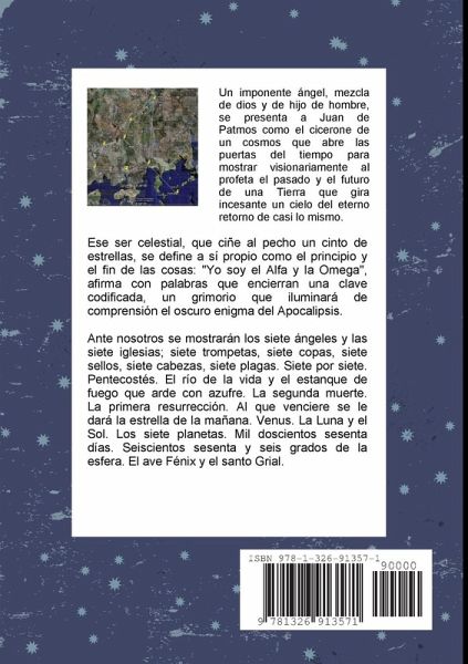 Ensayo sobre el Apocalipsis de Juan, que desarrolla una hipótesis de interpretación astronómica. Un ser celestial, que ciñe al pecho un cinto de estrellas, se define a sí propio como el principio y el fin de las cosas: "Yo soy el Alfa y la Omega", afirma con palabras que encierran una clave codificada, un grimorio que iluminará de comprensión el oscuro enigma del Apocalipsis. Ante nosotros se mostrarán los siete ángeles y las siete iglesias; siete trompetas, siete copas, siete sellos, siete cabezas, siete plagas. Siete por siete. Pentecostés. El río de la vida y el estanque de fuego que arde con azufre. La segunda muerte. La primera resurrección. Al que venciere se le dará la estrella de la mañana. Venus. La Luna y el Sol. Los siete planetas. Mil doscientos sesenta días. Seiscientos sesenta y seis grados de la esfera. El ave Fénix y el santo Grial.