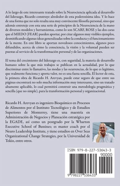 A lo largo de este interesante tratado sobre la Neurociencia aplicada al desarrollo del liderazgo, Ricardo construye alrededor de esta poderosísima idea. Y lo hace de una forma que no solo resalta una muy convincente filosofía personal, sino que además entreteje con esta una serie de principios de la Neurociencia de la mano de diversos modelos y herramientas, como lo son SCARF, ROSE y las dos caras que el MIEDO (FEAR) pueden aportar, por citar algunos muy visibles ejemplos, desmitificando algunas ideas generalizadas sobre la conducta y el funcionamiento de la mente. En este libro se aportan novedosos conocimientos, algunos poco difundidos, acerca de cómo la consciencia, la visión y la voluntad pueden ser puestas al servicio de la transformación personal y de las organizaciones. El tema del crecimiento del liderazgo es, con seguridad, la materia de desarrollo humano sobre la que más trabajos se publican en la actualidad, por lo que discriminar entre lo llamativo, las modas y las ocurrencias, de lo que es legítimo, que realmente funciona y aporta valor, no es una faena sencilla. El lector de esta, la primera obra de Ricardo H. Arevyan, puede estar seguro de que entre sus páginas encontrará no solo mucha información muy interesante, sino un tratado altamente aplicable, lo cual permitirá construir una metodología pragmática y sencilla (que no simple), para la transformación personal y organizacional. Lo sostengo no como resultado de la admiración que tengo del autor, como persona y profesional, sino ante todo, como testigo de que en estas páginas se sintetizan las ideas que han probado su eficacia entre las empresas que han confiado en él para operar como manager y después como su coach, pero principalmente que han sido la base de una transformación de mente, cuerpo y persona en un personaje fuera de serie: Ricardo H. Arevyan.