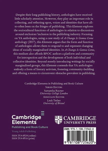 Anthologies have received little scholarly attention. However, they play an important role in collecting, and reflecting upon, voices and identities that have often been on the fringes of publishing. This Element explores the sociocultural functions of anthologies in relation to discussions around exclusion/inclusion in the publishing industry.