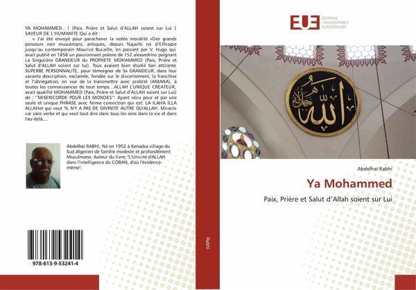 YA MOHAMMED.. ! (Paix, Prière et Salut d'ALLAH soient sur Lui ) SAVEUR DE L'HUMANITE Qui a dit : ' J'ai été envoyé pour parachever la noble moralité 'Des grands penseurs non musulmans, antiques, depuis Najachi roi d'Ethiopie jusqu'au contemporain Maurice Bucaille, en passant par V. Hugo qui avait publié en 1858 un passionnant poème de 152 alexandrins peignant La Singulière GRANDEUR du PROPHETE MOHAMMED (Paix, Prière et Salut d'ALLAH soient sur lui). Tous avaient bien étudié Son attirante SUPERBE PERSONNALITE, pour témoigner de Sa GRANDEUR, dans leur savante description, exclamée, fondée sur le discernement, la franchise et l'abnégation, en vue de la transmettre avec probité (AMANA), à toutes les connaissances de tout temps...ALLAH L'UNIQUE CREATEUR, avait qualifié MOHAMMED (Paix, Prière et Salut d'ALLAH soient sur Lui) de : ''MISERICORDE POUR LES MONDES'': Ayant vécu pour et par une seule et unique PHRASE avec ferme conviction qui est: LA ILAHA ILLA ALLAHet qui veut "IL N'Y A PAS DE DIVINITE AUTRE QU'ALLAH. Miracle car sans verbe et qui veut tout dire dans tous les sens dans la vie et dans l'au-delà....