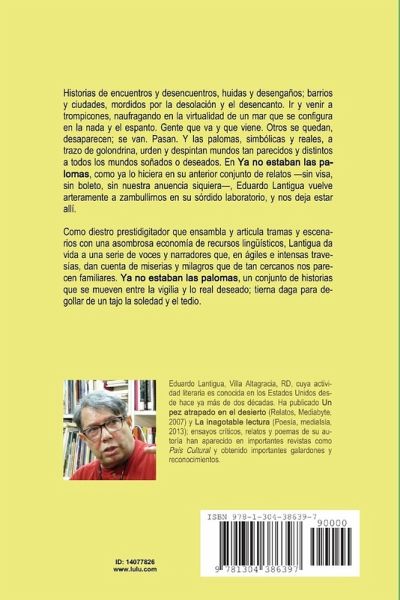 Historias de encuentros y desencuentros, huidas y desengaños; barrios y ciudades, mordidos por la desolación y el desencanto. Gente que va y que viene. Otros se quedan, desaparecen; se van. Pasan. Y las palomas, simbólicas y reales, a trazo de golondrina, trazan y despintan mundos tan parecidos y distintos a todos los mundos soñados o deseados. En "Ya no estaban las palomas", como ya lo hiciera en su anterior conjunto de relatos, Eduardo Lantigua vuelve arteramente a zambullirnos e en su sórdido laboratorio, y nos deja estar allí. Como diestro prestidigitador que ensambla y articula tramas y escenarios con una asombrosa economía de recursos lingüísticos, Lantigua da vida a una serie de voces y narradores que, en ágiles e intensas travesías, dan cuenta de miserias y milagros que de tan cercanos a nosotros nos parecen familiares. Ya no estaban las palomas, un conjunto de historias que se mueven entre la vigilia y lo real deseado; tierna daga para degollar de un tajo la soledad y el tedio.
