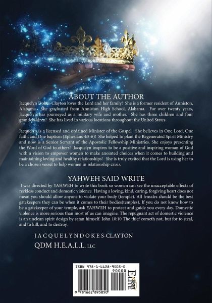 I was directed by YAHWEH to write this book so women can see the unacceptable effects of reckless conduct and domestic violence. Having a loving, kind, caring, forgiving heart does not mean you should allow anyone to violate your body (temple). All females should be the best gatekeepers they can be when it comes to their bodies(temples). If you do not know how to be a gatekeeper of your temple, ask YAHWEH to protect and guide you every day. Domestic violence is more serious than most of us can imagine. The repugnant act of domestic violence is an unclean spirit design by satan himself. John 10:10 The thief cometh not, but for to steal, and to kill, and to destroy. J A C Q U E L Y N D O K E S-CLAYTON QDM H.E.A.L.L. LLC Jacquelyn Dokes-Clayton loves the Lord and her family! She is a former resident of Anniston, Alabama. She graduated from Anniston High School, Alabama. For over twenty years, Jacquelyn has journeyed as a military wife and mother. She has three children and four grandchildren! She has lived in various locations throughout the United States. Jacquelyn is a licensed and ordained Minister of the Gospel. She believes in One Lord, One faith, and One baptism (Ephesians 4:5-6)! She helped to plant the Regenerated Spirit Ministry and now is a Senior Servant of the Apostolic Fellowship Ministries. She enjoys presenting the Word of God to others! Jacquelyn inspires to be a positive and inspiring woman of God with a vision to empower women to make anointed choices when it comes to building and maintaining loving and healthy relationships! She is truly excited that the Lord is using her to be a chosen vessel to help women in relationship crisis.
