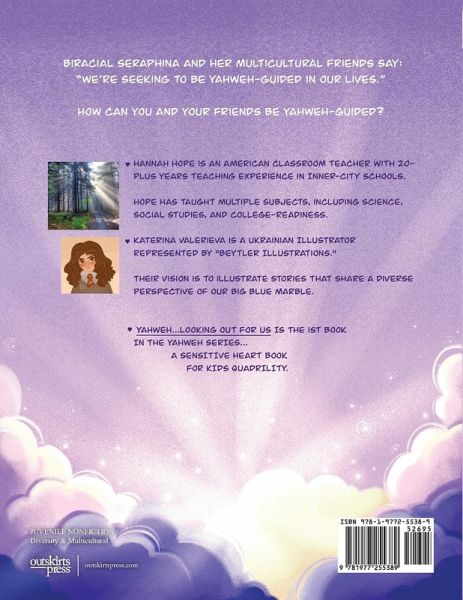 Biracial Seraphina and her multicultural friends say: "We're seeking to be Yahweh-guided in our lives." How can you and your friends be Yahweh- guided? Hannah Hope is an American classroom teacher with 20-plus years teaching experience in inner-city schools. Hope has taught multiple subjects including, including Science, Social Studies, and College-Readiness. Katerina Valerieva is a Ukrainian illustrator represented by "Beytler Illustrations". Their vision is to illustrate stories that share a diverse perspective of our big blue marble.