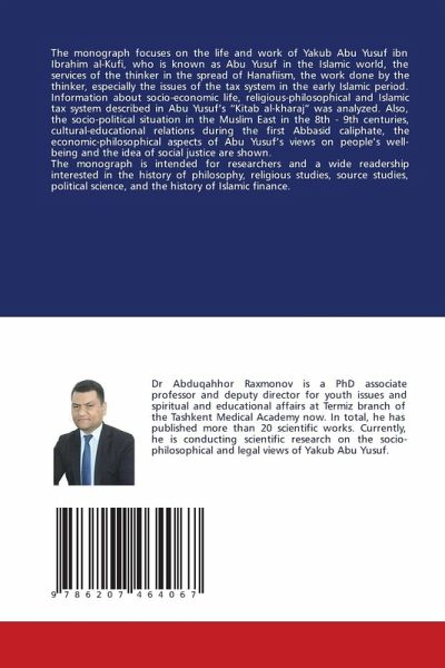 The monograph focuses on the life and work of Yakub Abu Yusuf ibn Ibrahim al-Kufi, who is known as Abu Yusuf in the Islamic world, the services of the thinker in the spread of Hanafiism, the work done by the thinker, especially the issues of the tax system in the early Islamic period. Information about socio-economic life, religious-philosophical and Islamic tax system described in Abu Yusuf's "Kitab al-kharaj" was analyzed. Also, the socio-political situation in the Muslim East in the 8th - 9th centuries, cultural-educational relations during the first Abbasid caliphate, the economic-philosophical aspects of Abu Yusuf's views on people's well-being and the idea of social justice are shown.The monograph is intended for researchers and a wide readership interested in the history of philosophy, religious studies, source studies, political science, and the history of Islamic finance.