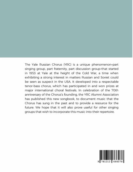 The Yale Russian Chorus (YRC) is a unique phenomenon-part singing group, part fraternity, part discussion group-that started in 1953 at Yale at the height of the Cold War, a time when exhibiting a strong interest in matters Russian and Soviet could be seen as suspect in the USA. It developed into a respectable tenor-bass chorus, which has participated in and won prizes at major international choral festivals. In celebration of the 70th anniversary of the Chorus's founding, the YRC Alumni Association has published this new songbook, to document music that the Chorus has sung in the past and to provide a resource for the future. We hope that it will also prove useful for other singing groups that wish to incorporate this music into their repertoire.