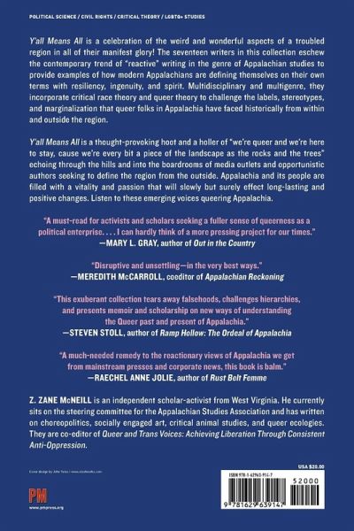 Y'all Means All is a celebration of the weird and wonderful aspects of a troubled region in all of their manifest glory! This collection is a thought-provoking hoot and a holler of "we’re queer and we’re here to stay, cause we’re every bit a piece of the landscape as the rocks and the trees" echoing through the hills of Appalachia and into the boardrooms of every media outlet and opportunistic author seeking to define Appalachia from the outside for their own political agendas. Multidisciplinary and multi-genre, Y’all necessarily incorporates elements of critical theory, such as critical race theory and queer theory, while dealing with a multitude of methodologies, from quantitative analysis, to oral history and autoethnography. This collection eschews the contemporary trend of "reactive" or "responsive" writing in the genre of Appalachian studies, and alternatively, provides examples of how modern Appalachians are defining themselves on their own terms. As such, it also serves as a toolkit for other Appalachian readers to follow suit, and similarly challenge the labels, stereotypes and definitions often thrust upon them. While providing blunt commentary on the region's past and present, the book’s soul is sustained by the resilience, ingenuity, and spirit exhibited by the authors; values which have historically characterized the Appalachian region and are continuing to define its culture to the present. This book demonstrates above all else that Appalachia and its people are filled with a vitality and passion for their region which will slowly but surely effect long-lasting and positive changes in the region. If historically Appalachia has been treated as a "mirror" of the country, this book breaks that trend by allowing modern Appalachians to examine their own reflections and to share their insights in an honest, unfiltered manner with the world.