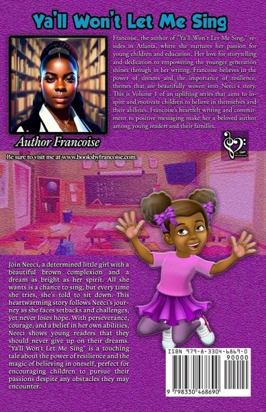 Hello, my name is Francoise Slaughter, and I believe everyone has a dream or something they feel destined to do. For many of us, that dream is inspired by our family. When I looked at mine, I saw generations of singers on both sides, and I knew from an early age that I wanted to follow in their footsteps. But figuring out where to begin wasn't easy. Still, giving up was never an option because my family never gave up on their talents. They taught me that the question isn't "Can I do it?" but rather "When will I do it, and how?" You are the key to unlocking your full potential. Even when you're little, you have your own special strengths. That's why I love to sing, "I am small, I am small, I may be little, but I know who I am!" This story is for kids like you-ages 7 to 9-who dream big and for parents who want to inspire their children to chase those dreams, no matter what! In Book 2 of the 5-part series, Y'all Won't Let Me Sing, we continue following Neeci and her family as she works toward her dream of becoming a singer in church. This installment brings more of Neeci's adventures, supported by her family, as she learns how to believe in herself and embrace her talents. And now, you can enjoy this story wherever you are! Be sure to get the audiobook for this and other chapters in the series, available on most major audiobook distribution platforms. Let's keep dreaming, singing, and growing together!