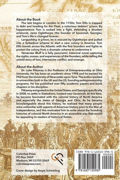 The tale begins in London in the 1730s; Tom Ellis is trapped in debt and heading for the Fleet, a notorious debtors' prison. By happenstance Tom is sucked into a fight, defending a drunken aristocrat, Jame Oglethorpe (the founder of Savannah, Georgia), and Tom's life is changed forever.Languishing in prison, he is rescued by Oglethorpe and pulled into a fantastical scheme to start a new colony in America. Tom Ellis travels across the Atlantic with the first founders and fights to protect the colony from a dramatic scheme to undermine itYamacraw Bluff is a fully panoramic historical novel capturing the sights, scenes, and experiences of the founders, while telling the untold story of loss, internecine conflict, and revenge.