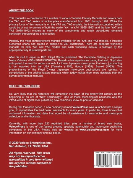 This manual is a compilation of a number of various Yamaha Factory Manuals and covers both the YA5 & YA6 series of motorcycles manufactured from 1961-67. The primary focus of this manual is on the YA5-YA6 models, the information contained within would be of use to owners of both the earlier YA1-YA4 (55-60) and the later YA7 & YA8 (68-72) models.