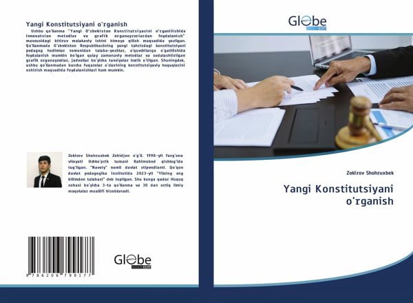 Ushbu qo`llanma "Yangi O'zbekiston Konstitutsiyasini o'rganilishida innovatsion metodlar va grafik organayzerlardan foydalanish" mavzusidagi bitiruv malakaviy ishini himoya qilish maqsadida yozilgan. Qo`llanmada O`zbekiston Respublikasining yangi tahrirdagi konstitutsiyani pedagog hodimlar tomonidan talaba-yoshlar, o`quvchilarga o`gatilishida foydalanish mumkin bo`lgan qulay zamonaviy metodlar va sodalashtirilgan grafik organayzerlar, jadvallar bo`yicha tavsiyalar berib o`tilgan. Shuningdek, ushbu qo`llanmadan barcha fuqarolar o`zlarining konstitutsiyaviy huquqlarini oshirish maqsadida foydalanishlari ham mumkin.