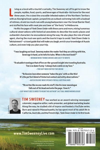 As an American who lived in Australia for three years, Tim Sweeney has a unique-and often highly comical-perspective on life Down Under. Lucky for us, he has a gift for bringing the reader along for the ride as he observes and relays hilarious stories about the places he visited and the characters he met along the way. And there are plenty of those. Sweeney fills the pages of Yank Down Under with witty cultural observations and historical perspective as he cruises the crocodile-infested waters of the Northern Territory with an Aboriginal guide, jumps into an Outback swimming hole with a busload of retirees, scuba dives on the Great Barrier Reef, and stuffs his face with beers and meat pies at an Australian Rules Football match. Yank Down Under is "info-tainment." It will make you laugh, teach you a few things about Aussie culture, and maybe even have you booking your own Australian adventure. Readers say Sweeney "writes like no one reads his stuff; just what falls out of his head and onto the page." Mixing historical anecdotes with humor and the occasional hangover, the award-winning journalist recounts his (mis)adventures and encounters with the people, reptiles, food, sports and beverages that make Australia a magical destination for many. Then, after each section, he offers a bonus to his laugh-out-loud stories by sharing brief summaries of the must-see spots and the tourist traps to avoid. Yank Down Under is for anyone-even Aussies-who appreciates a witty tale and an adventure on the road. It's also for anyone planning their own Aussie adventure, looking to reminisce about the one they already took, or just wondering if Australia is as exotic and as lively as it sounds. Spoiler alert: with Tim Sweeney playing tour guide, it is!