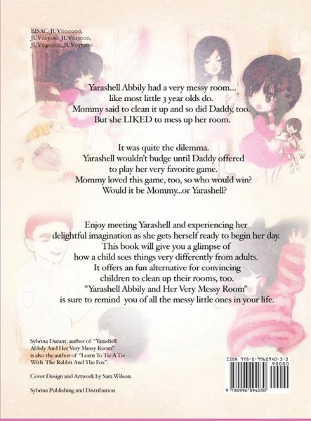 Yarashell Abbily had a very messy room...like most little 3 year olds do. Mommy said to clean it up and so did Daddy, too. But she LIKED to mess up her room. It was quite the dilemma. Yarashell wouldn't budge until Daddy offered to play her very favorite game. Mommy loved this game, too, so who would win? Who would win the game? Would it be Mommy...or Yarashell? Enjoy meeting Yarashell and experiencing her delightful imagination as she gets herself ready to begin her day. This book will give you a glimpse of how a child sees things very differently from adults. Yarashell is sure to remind you of all the messy little ones in your life. With its sing-song verse, this book is a great family read. The accompanying song can be heard for free at sybrina.com.