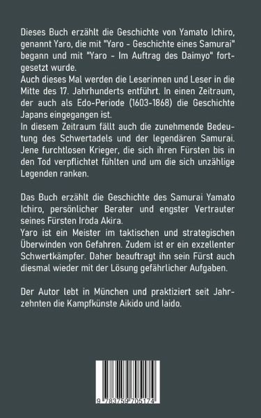 In diesen Buch wird die Geschichte von Yamato Ichiro, auch Yaro genannt, erzählt, die mit "Yaro - Geschichte eines Samurai" begann und mit "Yaro - Im Auftrag des Daimyo" fortgesetzt wurde. Auch dieses Mal werden die Leserinnen und Leser in die Mitte des 17. Jahrhunderts entführt. Das Buch erzählt die Geschichte des Samurai Yamato Ichiro, persönlicher Berater und engster Vertrauter seines Fürsten Iroda Akira. Aufgrund seiner geistigen Fähigkeiten, Gefahren taktisch und strategisch durchdacht zu überwinden, und seiner körperlichen Geschicklichkeit, die ihn zu einem hervorragenden Schwertkämpfer macht, wird Yaro von seinem Fürsten auch diesmal mit der Lösung gefährlicher Aufgaben betraut.