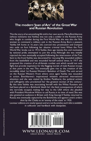 The modern 'Joan of Arc' of the Great War and Russian Revolution This the story of an astonishing life told in her own words. Maria Botchkareva (whose nickname was Yashka) was not only a soldier in the Russian Army who fought in combat during the First World War, she was also the first woman to command a military unit in the Russian Army. Born a peasant, Yashka left home at 16 years old, coerced into prostitution and tramped into exile on foot following her abusive criminal lover. When the First World War broke out in 1914, Yashka then age twenty-five and motivated by national pride, attempted to join the army. Although she was initially rejected she was eventually accepted following the intercession of the Tsar. Sent to the front Yashka was decorated for rescuing fifty wounded soldiers from the battlefield and was wounded herself several times. In 1917 she proposed the creation of an all-female combat unit which would not only fight, but provide inspiration for the flagging morale of male Russian troops at that point in the war. This eventually gave rise to the creation of the incredibly titled 1st Russian Women's Battalion of Death. The unit served on the Russian Western Front where once again Yashka was wounded in action. Botchkareva's inspirational initiative attracted international attention and she was visited by Emiline Pankhurst, the political activist and suffragette who proclaimed her 'the greatest woman of the century'. By this time Yashka was associating herself with the White Russians and had been placed on a Bolshevik 'death list', the fatal consequences of which she narrowly escaped, making her way to the USA where she pleaded with President Woodrow Wilson to aid Russia in its time of need. She was also granted an audience in Britain with King George V. Yashka returned to Russia, was eventually captured by the Bolsheviks and against Lenin's orders shot by the Cheka as an 'enemy of the state' in 1920. Leonaur editions are newly typeset and are not facsimiles; each title is available in softcover and hardback with dustjacket.