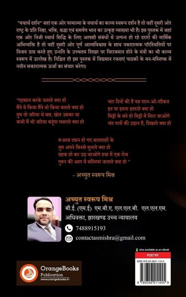 Yatharth Darshan is a bouquet of scintillating Poetry written by Achyut Swaroop Mishra. These poetry are in fact reflection of truth of Life , relations and Omnipotent God. Yatharth Darshan positive living life with the spirit and filled with abundant energy Inspired also to hoist the flag of victory at the highest peak of success does.