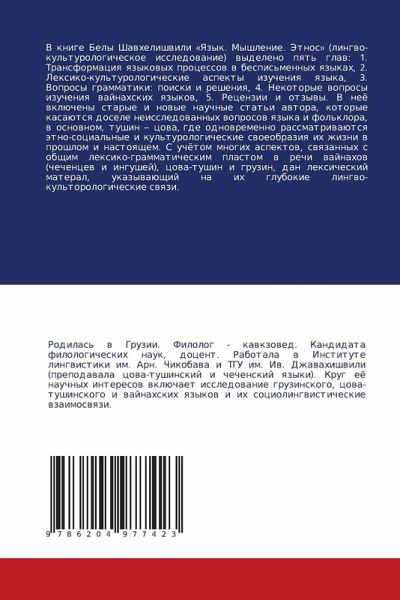 V knige Bely Shawhelishwili 'Yazyk. Myshlenie. Jetnos' (lingwo-kul'turologicheskoe issledowanie) wydeleno pqt' glaw: 1. Transformaciq qzykowyh processow w bespis'mennyh qzykah, 2. Lexiko-kul'turologicheskie aspekty izucheniq qzyka, 3. Voprosy grammatiki: poiski i resheniq, 4. Nekotorye woprosy izucheniq wajnahskih qzykow, 5. Recenzii i otzywy. V neö wklücheny starye i nowye nauchnye stat'i awtora, kotorye kasaütsq dosele neissledowannyh woprosow qzyka i fol'klora, w osnownom, tushin - cowa, gde odnowremenno rassmatriwaütsq ätno-social'nye i kul'turologicheskie swoeobraziq ih zhizni w proshlom i nastoqschem. S uchötom mnogih aspektow, swqzannyh s obschim lexiko-grammaticheskim plastom w rechi wajnahow (chechencew i ingushej), cowa-tushin i gruzin, dan lexicheskij materal, ukazywaüschij na ih glubokie lingwo-kul'torologicheskie swqzi.
