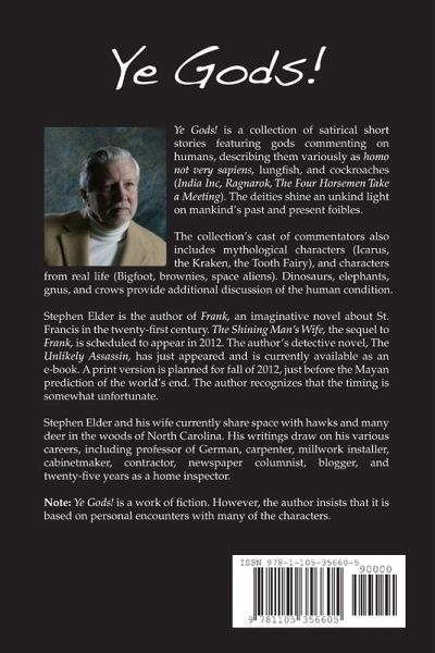 "Ye Gods!" 1. exclamation of surprise 2. collection of short stories ranging from dark whimsy to scathing satire. Warning: this collection contains occasional wry humor, biting political commentary, social criticism, and dire prognostication. Side effects include but are not limited to: laughter, head shaking, and 3 AM epiphanies. Occasional tears have been reported. Characters are taken from various pantheons (Zeus, Shiva), classical literature/mythology (Icarus), history (Custer), and real life (Bigfoot, space aliens). This collection is intended to relieve the symptoms of boredom and ennui. It may be taken straight or with a grain of salt. Store in brightly lit areas such as beside a comfortable chair or on a bedside table.