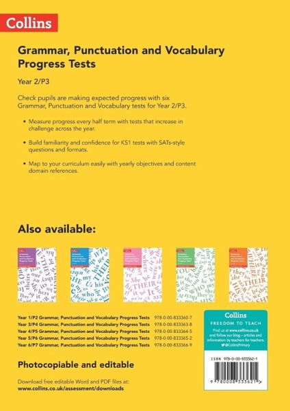 Ensure Year 2/P3 children know the National Curriculum 2014 requirements and are fully prepared for the Year 2 SATs with half termly grammar, punctuation and vocabulary progress tests. With six tests per year and a photocopiable record sheet, you can quickly find out which rules children find tricky and focus on those.