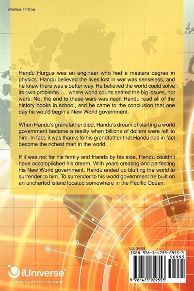 Handu Hurgus was an engineer who had a masters degree in physics. Handu believed the lives lost in war was senseless, and he knew there was a better way. He believed the world could solve its own problems..... where world courts settled the big issues, not wars. No, the end to these wars was near. Handu read all of the history books in school, and he came to the conclusion that one day he would begin a New World government. When Handu's grandfather died, Handu's dream of starting a world government became a reality when billions of dollars were left to him. In fact, it was thanks to his grandfather that Handu had in fact become the richest man in the world. If it was not for his family and friends by his side, Handu couldn't have accomplished his dream. With years creating and perfecting his New World government, Handu ended up bluffing the world to surrender to him. To surrender to his world government he built on an uncharted island located somewhere in the Pacific Ocean.