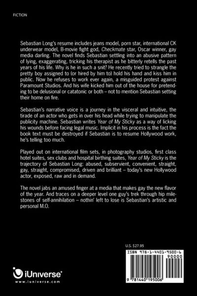 Sebastian Long's resume includes jeans model, porn star, international CK underwear model, B-movie fight god, Checkmate star, Oscar winner, gay media darling. The novel finds Sebastian settling into an abusive pattern of lying, exaggerating, tricking his therapist as he bitterly retells the past years of his life. Why is he in such a snit? He recently tried to strangle the pretty boy assigned to (or hired by him to) hold his hand and kiss him in public. Now he refuses to work ever again, a misguided protest against Paramount Studios. And his wife kicked him out of the house for pretending to be delusional or catatonic or both - not to mention Sebastian setting their home on fire. Sebastian's narrative voice is a journey in the visceral and intuitive, the tirade of an actor who gets in over his head while trying to manipulate the publicity machine. Sebastian writes Year of My Sticky as a way of licking his wounds before facing legal music. Implicit in his process is the fact the book text must be destroyed if Sebastian is to resume Hollywood work, he's telling too much. Played out on international film sets, in photography studios, first class hotel suites, sex clubs and hospital birthing suites, Year of My Sticky is the trajectory of Sebastian Long: abused, subservient, convenient, straight, gay, straight, compromised, driven and brilliant - today's new Hollywood actor, exposed, raw and in demand. The novel jabs an amused finger at a media that makes gay the new flavor of the year. And traces on a deeper level one guy's trek through hip milestones of self-annihilation - nothin' left to lose is Sebastian's artistic and personal M.O.