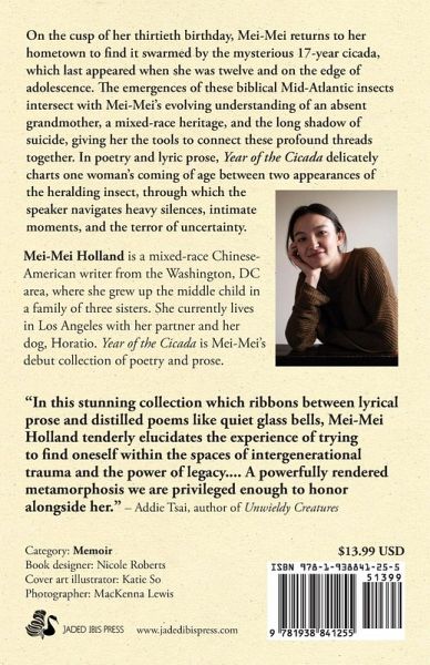 On the cusp of her thirtieth birthday, Mei-Mei returns to her hometown to find it swarmed by the mysterious 17-year cicada, which last appeared when she was twelve and on the edge of adolescence. The emergences of these biblical Mid-Atlantic insects intersect with Mei-Mei's evolving understanding of an absent grandmother, a mixed-race heritage, and the long shadow of suicide, giving her the tools to connect these profound threads together. In poetry and lyric prose, Year of the Cicada delicately charts one woman's coming of age between two appearances of the heralding insect, through which the speaker navigates heavy silences, intimate moments, and the terror of uncertainty.