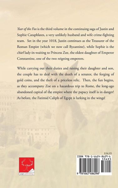 Year of the Fox is the third volume in the continuing saga of Justin and Sophie Cataphlates, a very unlikely husband and wife crime-fighting team. Set in the year 1018, Justin continues as the Treasurer of the Roman Empire (which we now call Byzantine), while Sophie is the chief lady-in-waiting to Princess Zoe, the oldest daughter of Emperor Constantine, one of the two reigning emperors. While carrying out their duties and raising their daughter and son, the couple has to deal with the death of a senator, the forging of gold coins, and the theft of a priceless relic. Then, the fun begins, as they accompany Zoe on a hazardous trip to Rome, the long-ago abandoned capital of the empire where the papacy itself is in danger! As before, the Fatimid Caliph of Egypt is lurking in the wings!