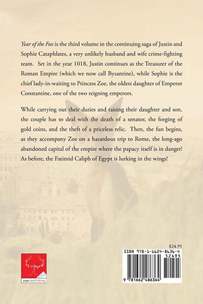 Year of the Fox is the third volume in the continuing saga of Justin and Sophie Cataphlates, a very unlikely husband and wife crime-fighting team. Set in the year 1018, Justin continues as the Treasurer of the Roman Empire (which we now call Byzantine), while Sophie is the chief lady-in-waiting to Princess Zoe, the oldest daughter of Emperor Constantine, one of the two reigning emperors. While carrying out their duties and raising their daughter and son, the couple has to deal with the death of a senator, the forging of gold coins, and the theft of a priceless relic. Then, the fun begins, as they accompany Zoe on a hazardous trip to Rome, the long-ago abandoned capital of the empire where the papacy itself is in danger! As before, the Fatimid Caliph of Egypt is lurking in the wings!