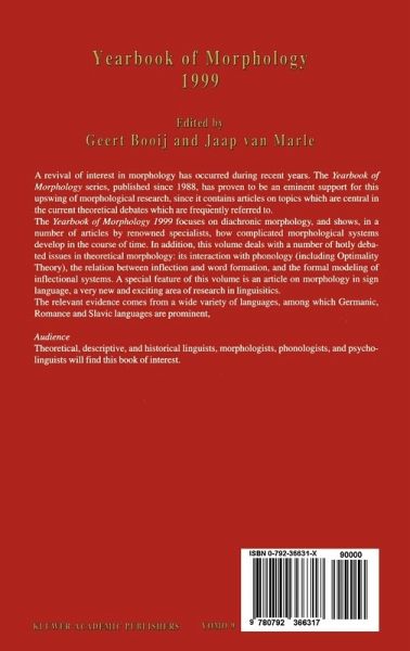 The Yearbook of Morphology 1999 focuses on diachronic morphology, and shows, in a number of articles by renowned specialists, how complicated morphological systems develop in the course of time. In addition, this volume deals with a number of hotly debated issues in theoretical morphology: its interaction with phonology (including Optimality Theory), the relation between inflection and word formation, and the formal modeling of inflectional systems. A special feature of this volume is an article on morphology in sign language, a very new and exciting area of research in linguistics.