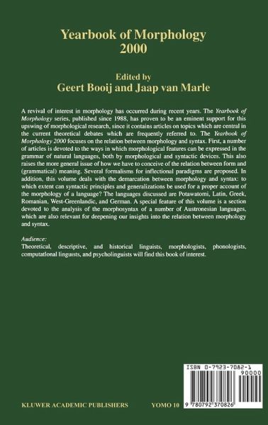 The Yearbook of Morphology 2000 focuses on the relation between morphology and syntax. First, a number of articles is devoted to the ways in which morphological features can be expressed in the grammar of natural languages, both by morphological and syntactic devices. This also raises the more general issue of how we have to conceive of the relation between form and (grammatical) meaning. Several formalisms for inflectional paradigms are proposed. In addition, this volume deals with the demarcation between morphology and syntax: to which extent can syntactic principles and generalizations be used for a proper account of the morphology of a language? The languages discussed are Potawatomi, Latin, Greek, Romanian, West-Greenlandic, and German. A special feature of this volume is a section devoted to the analysis of the morphosyntax of a number of Austronesian languages, which are also relevant for deepening our insights into the relation between our morphology and syntax.