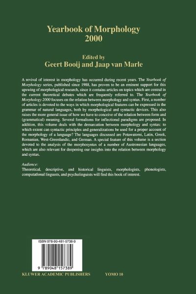 The Yearbook of Morphology 2000 focuses on the relation between morphology and syntax. First, a number of articles is devoted to the ways in which morphological features can be expressed in the grammar of natural languages, both by morphological and syntactic devices. This also raises the more general issue of how we have to conceive of the relation between form and (grammatical) meaning. Several formalisms for inflectional paradigms are proposed. In addition, this volume deals with the demarcation between morphology and syntax: to which extent can syntactic principles and generalizations be used for a proper account of the morphology of a language? The languages discussed are Potawatomi, Latin, Greek, Romanian, West-Greenlandic, and German. A special feature of this volume is a section devoted to the analysis of the morphosyntax of a number of Austronesian languages, which are also relevant for deepening our insights into the relation between our morphology and syntax.