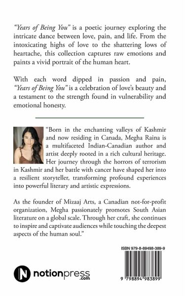 "Years of Being You" is a poetic journey exploring the intricate dance between love, pain, and life. From the intoxicating highs of love to the shattering lows of heartache, this collection captures raw emotions and paints a vivid portrait of the human heart. With each word dipped in passion and pain, "Years of Being You" is a celebration of love's beauty and a testament to the strength found in vulnerability and emotional honesty.
