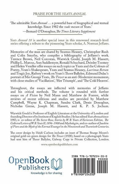 Yeats Annual No. 18 is another special issue in this renowned research-level series offering a tribute to the pioneering Yeats scholar, A. Norman Jeffares. Memories of the man are shared by Seamus Heaney, Christopher Rush and Colin Smythe, who compiles a bibliography of Jeffares's work. Terence Brown, Neil Corcoran, Warwick Gould, Joseph M. Hassett, Phillip L. Marcus, Ann Saddlemyer, Ronald Schuchard, Deirdre Toomey and Helen Vendler offer essays on such topics as Yeats and the Colours of Poetry, Yeats's Shakespeare, Yeats and Seamus Heaney, Lacrimae Rerum and Tragic Joy, Raftery's work on Yeats's Thoor Ballylee, Edmund Dulac's portrait of Mrs George Yeats, The Tower as an anti-Modernist monument, with close studies of 'Vacillation', 'Her Triumph', and 'The Cold Heaven'. Throughout, the essays are inflected with memories of Jeffares and his critical methods. The volume is rounded with further essays on A Vision by Neil Mann and Matthew de Forrest, while reviews of recent editions and studies are provided by Matthew Campbell, Wayne K. Chapman, Sandra Clark, Denis Donoghue, Nicholas Grene, Joseph M. Hassett, and K.P.S. Jochum. Yeats Annual is published by Open Book Publishers in association with the Institute of English Studies. Further details, including how to order back issues, can be found at: http://www.ies.sas.ac.uk/publications/yeats-annual