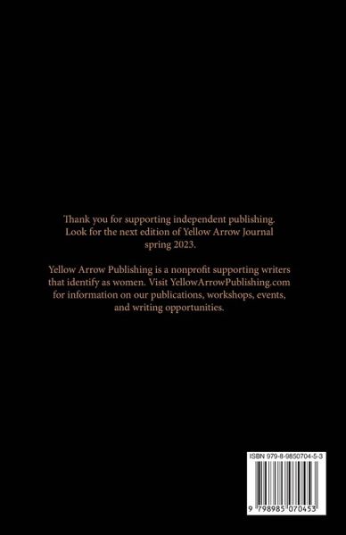 Yellow Arrow Journal is a biannual literary journal of creative nonfiction, poetry, and cover art by writers/artists that identify as women. The theme for this issue is PEREGRINE. Featuring: Rina Malagayo Alluri, Elizabeth Bowden-David, Rebecca Brock, Wren Donovan, Elaine Elinson, Patricia Falkenburg, Jen Gayda Gupta, Christine C. Hsu, Blaise Allysen Kearsley, Amanda Kooser, Christina Lengyel, Diann Leo-Omine, Kari Ann Martindale, Oanh Nguyen, Tamiko Nimura, Ray Oldham, Maria S. Picone, Janet M. Powers, Leticia Priebe Rocha, Kathryn Reese, Laura Rockhold, Ellen Skilton, and Hana Worku. Cover Art: Daryle Newman Cover Design: Alexa Laharty Editor-in-Chief: Kapua Iao Guest Editor: Raychelle Heath Editorial Associates: Jackie Alvarez-Hernandez, Siobhan McKenna, Beck Snyder, and Rachel Vinyard Thank you for supporting independent publishing.