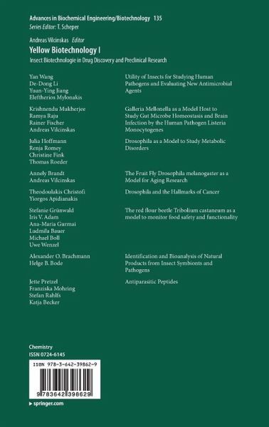 Utility of Insects for Studying Human Pathogens and Evaluating New Antimicrobial Agents, by Yan Wang, De-Dong Li, Yuan-Ying Jiang and Eleftherios Mylonakis. Galleria Mellonella as a Model Host to Study Gut Microbe Homeostasis and Brain Infection by the Human Pathogen Listeria Monocytogenes, by Krishnendu Mukherjee, Ramya Raju, Rainer Fischer and Andreas Vilcinskas. Drosophila as a Model to Study Metabolic Disorders, by Julia Hoffmann, Renja Romey, Christine Fink and Thomas Roeder. The Fruit Fly Drosophila melanogaster as a Model for Aging Research, by Annely Brandt and Andreas Vilcinskas. Drosophila and the Hallmarks of Cancer, by Theodoulakis Christofi and Yiorgos Apidianakis. The red flour beetle Tribolium castaneum as a model to monitor food safety and functionality, by Stefanie Grünwald, Iris V. Adam, Ana-Maria Gurmai, Ludmila Bauer, Michael Boll, and Uwe Wenzel. Identification and Bioanalysis of Natural Products from Insect Symbionts and Pathogens, by Alexander O. Brachmann and Helge B. Bode. Antiparasitic Peptides, by Jette Pretzel, Franziska Mohring, Stefan Rahlfs and Katja Becker.