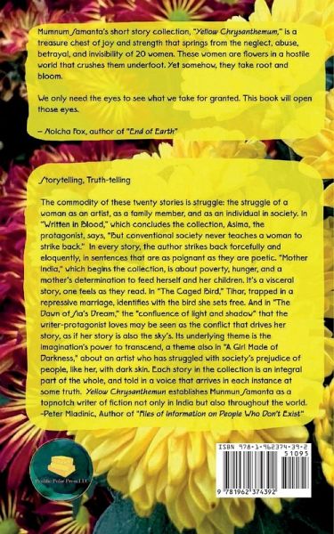 Set in contemporary India, "Yellow Chrysanthemum" is a stirring collection celebrating the lives of Durga, Uma, Tihar, Somlata, Mridula, and fifteen other women from rural villages to bursting cities. These women are not passive victims but survivors and warriors who have the courage to challenge the status quo of society, which always seeks to silence their voices. As the author, I wrote this book to pay my homage to the women who continue challenging society's oppressive forces. If you are in search of a book that will both challenge and inspire you, "Yellow Chrysanthemum" is a top pick. Take part in the celebration of women's voices, a call for justice, and a reminder of the incredible power that exists within us all to rise above, no matter the odds. Munmun Samanta "Sam"