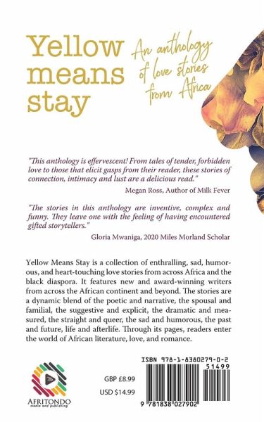 **Afritondo Prize 2020** Yellow Means Stay is a collection of enthralling, sad, humorous, and heart-touching love stories from across Africa and the black diaspora. It features new and award-winning writers from across the African continent and beyond. The stories are a dynamic blend of the poetic and narrative, the spousal and familial, the suggestive and explicit, the dramatic and measured, the straight and queer, the sad and humorous, the past and future, life and afterlife. Through its pages, readers enter the world of African literature, love, and romance. "This anthology is effervescent! From tales of tender, forbidden love to those that elicit gasps from their reader, these stories of connection, intimacy and lust are a delicious read." - Megan Ross, Author of Milk Fever "The stories in this anthology are inventive, complex and funny. They leave one with the feeling of having encountered gifted storytellers." - Gloria Mwaniga, 2020 Miles Morland Scholar.