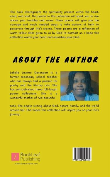 This book photographs the spirituality present within the heart, mind, and soul. The poems in this collection will spark you to rise above your troubles and woes. These poems will give you the courage and much needed steps to take actions of faith to persevere through life's storms. These poems are a reflection of warm yellow skies given to us by God to comfort us. I hope this collection warms your heart and nourishes your mind.