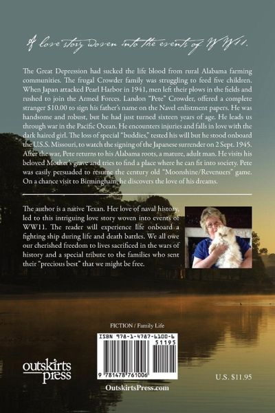 A love story woven into the events of WW11. The Great Depression had sucked the life blood from rural Alabama far Yellowhammerming communities. The frugal Crowder family was struggling to feed five children. When Japan attacked Pearl Harbor in 1941, men left their plows in the fields and rushed to join the Armed Forces. Landon "Pete" Crowder, offered a complete stranger $10.00 to sign his father's name on the Navel enlistment papers. He was handsome and robust, but he had just turned sixteen years of age. He leads us through war in the Pacific Ocean. He encounters injuries and falls in love with the dark haired girl. The loss of special "buddies," tested his will but he stood onboard the U.S.S. Missouri, to watch the signing of the Japanese surrender on 2 Sept. 1945. After the war, Pete returns to his Alabama roots, a mature, adult man. He visits his beloved Mother's grave and tries to find a place where he can fit into society. Pete was easily persuaded to resume the century old "Moonshine/Revenuers" game. On a chance visit to Birmingham, he discovers the love of his dreams. The author is a native Texan. Her love of naval history, led to this intriguing love story woven into events of WW11. The reader will experience life onboard a fighting ship during life and death battles. We all owe our cherished freedom to lives sacrificed in the wars of history and a special tribute to the families who sent their "precious best" that we might be free.