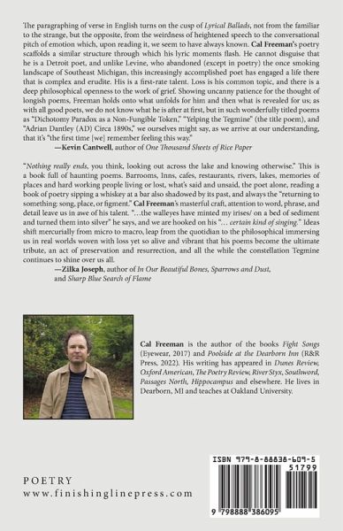 Cal Freeman's chapbook, Yelping the Tegmine, offers a series of elliptical Yelp reviews for real, imagined, and shuttered bars and restaurants throughout the Great Lakes region. Within this, Freeman covers topics like labor history, freshwater ecology, addiction, and mental illness. Several of these poems have appeared in leading American and international journals including Oxford American.